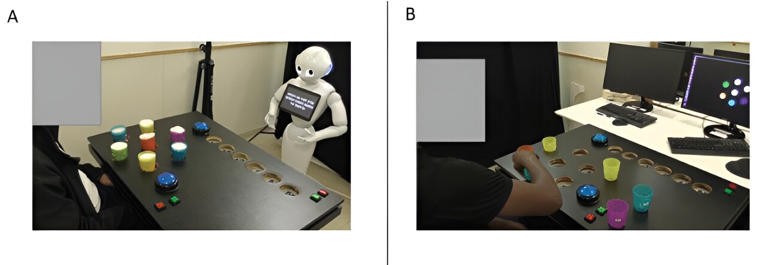 The experimental setup. A. Participant in the ROBOT group. The social robot Pepper gives instructions and feedback to the patient, which are presented both on the robot’s tablet screen and verbally. B. Participant in the COMPUTER group. The instructions and feedback are presented both on a computer screen and verbally. Credit: IEEE Transactions on Neural Systems and Rehabilitation Engineering (2024). DOI: 10.1109/TNSRE.2024.3387320