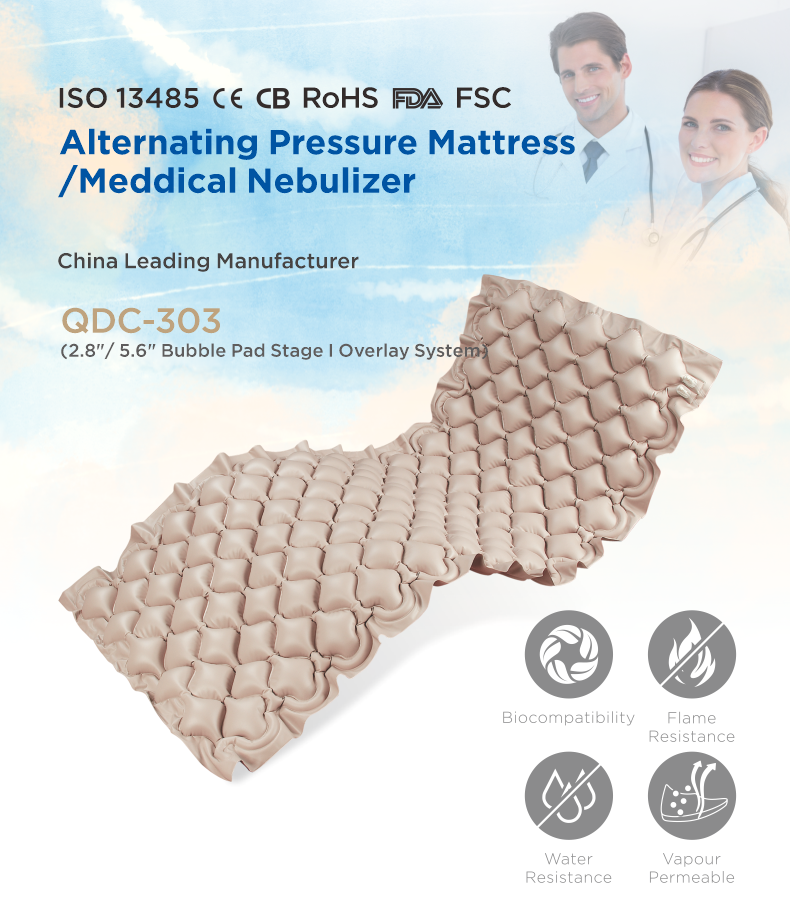 QDC-303 is designed for the treatment and prevention of pressure sore stage l in short-term and domicillary theraples. The mattress in PVC is composed of 130 7cm-high bubblecells, particularly comfortable, it is fixed to the bed by extra flaps on both top and bottomside. Very easy to install, maintain and use thanks to the possibility of adjust comfortrange. The pump can be hung to the end of the bed by means of two hooks.