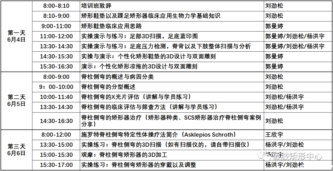 本次培训班以临床实用为根本,理论与实际操作练习相结合,分享假肢矫形中心宝贵的临床经验,学员可掌握脊柱侧弯评估、筛查、扫描、矫形器穿戴以及调整、踝足生物力学基本知识、足部评估、足部扫描等方法,了解施罗特方法对脊柱侧弯的治疗作用、脊柱侧弯矫形器的3D加工、矫形鞋垫的3D设计以及加工。迅速开展相关的专业工作,服务当地患者。