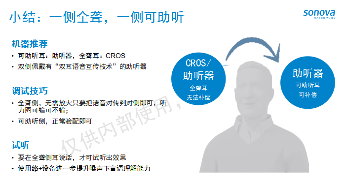 非对称性听力损失主要有两种类型,一种为一侧全聋,一侧可助听;另一种为双侧都可助听但有较好耳。分享会上,孙静分别为我们介绍了两种类型的主要解决方案,并提出面对非对称性听力损失,不应放弃双耳验配,要积极发挥双耳语音互传技术实现“BICROS”功能。