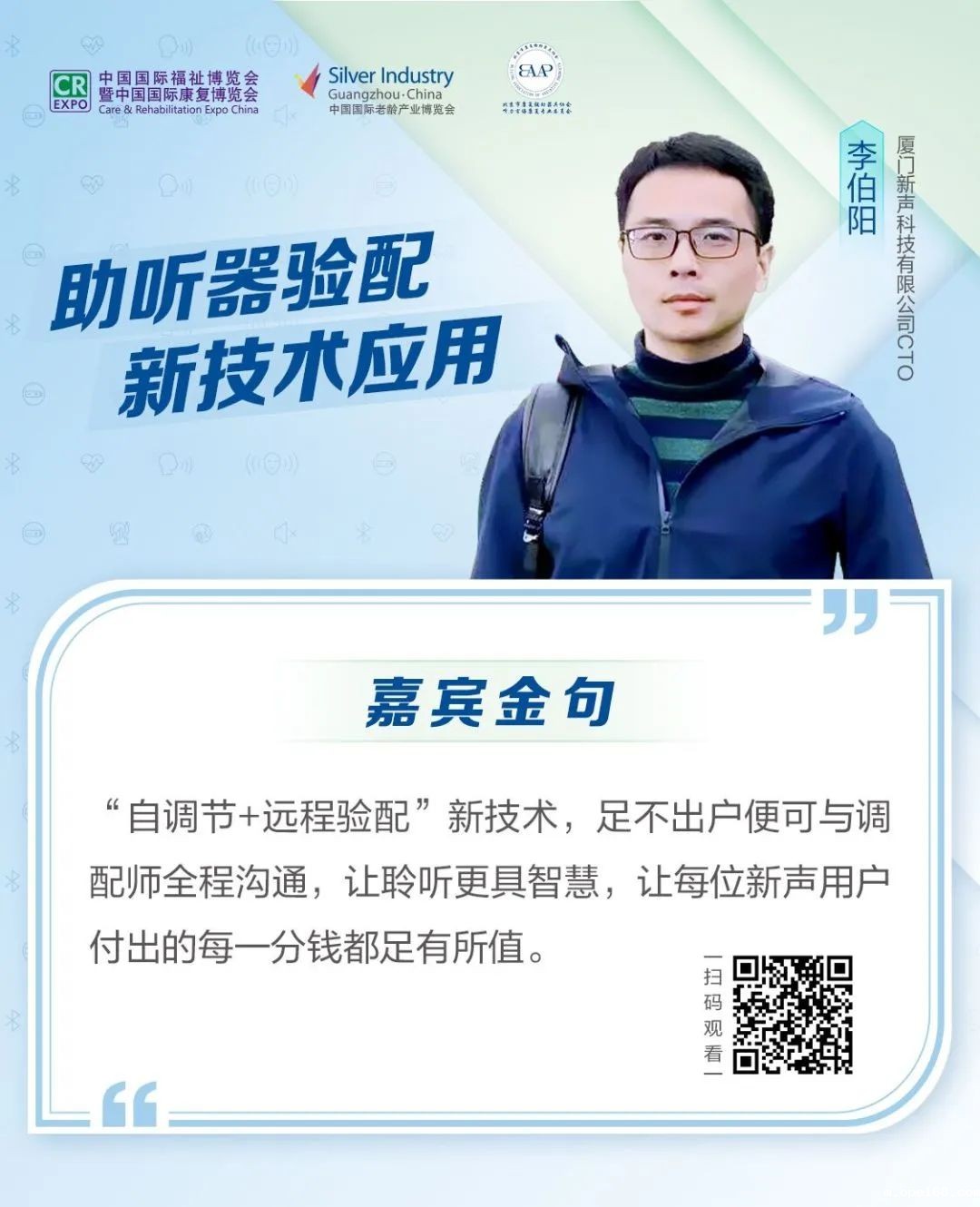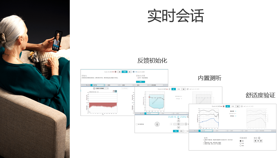 分享会上李伯阳指出目前我国听力现状的痛点和现状,并基于此提出了“自调节+远程配验”技术的机遇和挑战。同时也为我们分享了临床案例分析,从而证实了该技术的可行性与优势,使听力受损患者能够足不出户便能与调配师全程沟通,让聆听变得更具智慧。