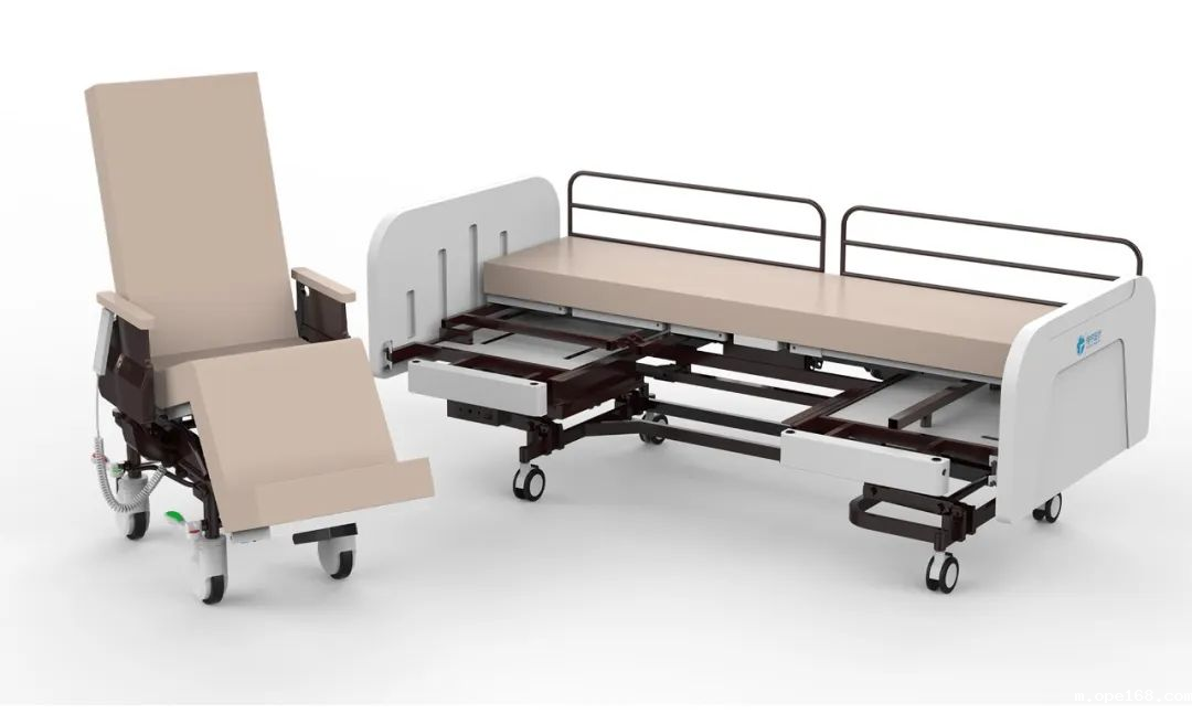 多功能康复护理床包括床体部分和轮椅部分,能够实现床体部分与轮椅部分的合体和分离。在合体状态下,床体部分和轮椅部分可作为一个整体,具备一定的护理功能,能够实现患者的卧姿、起背和曲腿等姿势的调整。在分离状态下,患者可由医护人员从床体平移到轮椅上,此时的轮椅处于展平状态,患者可躺卧在上面,当需要转移患者时,可收合轮椅,使患者处于坐姿状态。能够通过合体或分离实现患者的自由转移。