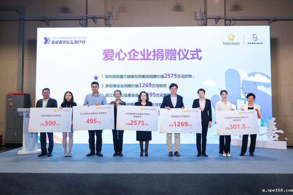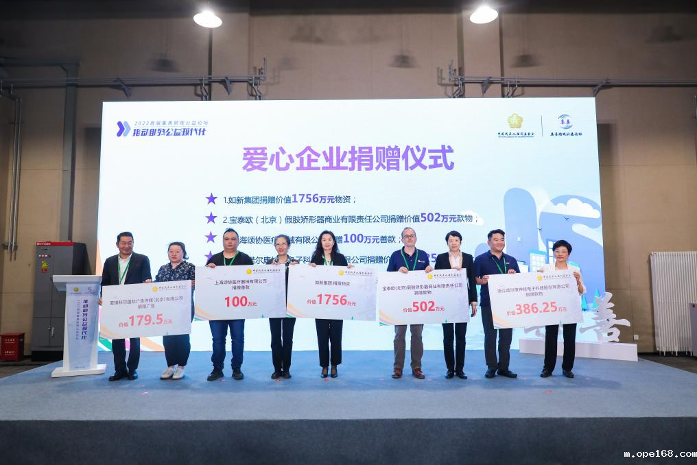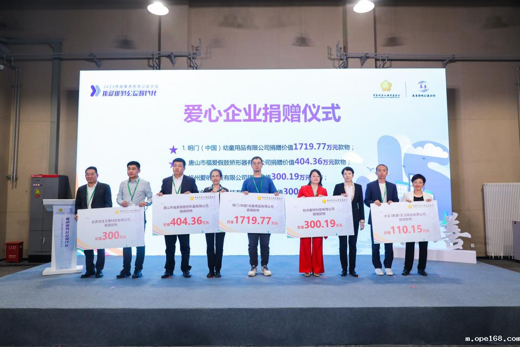 (上三图为可孚医疗科技股份有限公司、新矩基金会、深圳美丽魔方健康投资集团、浙江蚂蚁公益基金会、正保远程教育、宝泰欧(北京)假肢矫形器商业有限责任公司、上海颂协医疗器械有限公司、如新集团、浙江诺尔康神经电子科技股份有限公司、亚瑞科尔国际广告传媒(北京)有限公司、大王(南通)生活用品有限公司、杭州爱听科技有限公司、明门(中国)幼童用品有限公司、唐山市福爱假肢矫形器有限公司、北京创洁卫康科技有限公司等15家爱心企业和机构向中国残疾人福利基金会捐赠了总价值1.07亿元的款物)