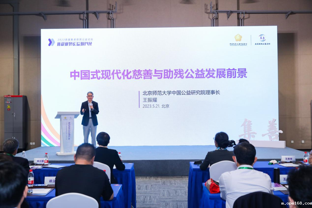 主旨演讲环节,北京师范大学中国公益研究院理事长王振耀以《中国式现代化慈善与助残公益发展前景》为题进行主旨演讲,他指出,中国的公益事业正处于快速发展的阶段,推动和实现助残公益现代化需要政府、社会组织、企业等多方的共同努力。只有通过各方面的支持和合作,才能够实现助残公益事业的现代化和可持续发展。