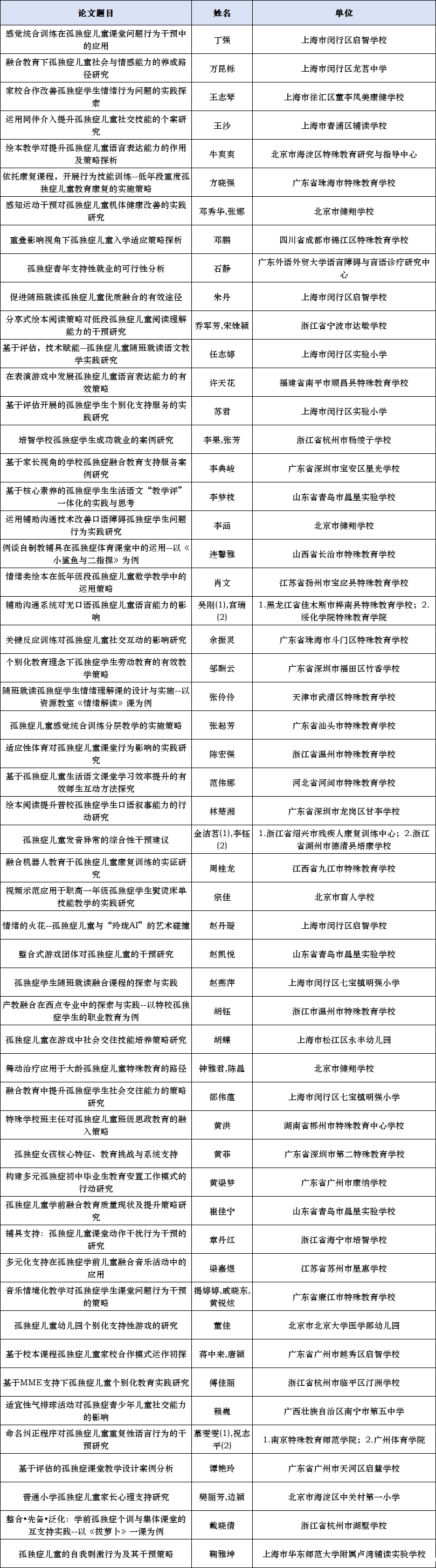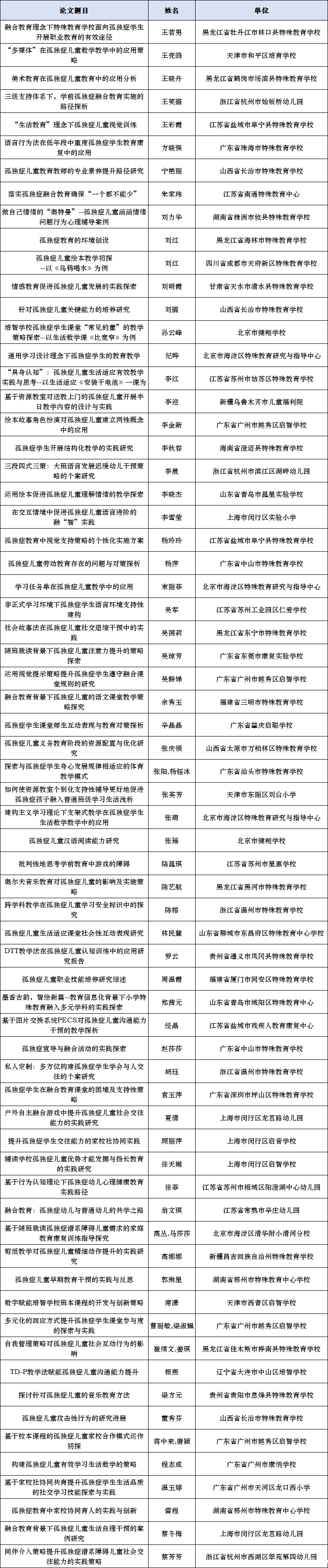 公布第一届孤独症教育教学征集优秀组织单位,优秀、创新和鼓励论文名单;公布第一届孤独症教学案例优秀组织单位,优秀、创新和鼓励课例名单