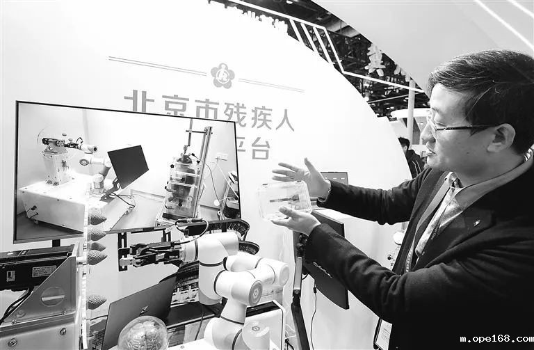 图为在2024米兰国际足球直播在哪看北京市残联展位上,北京芯智达神经技术有限公司工作人员介绍基于脑机接口的“北脑一号”和“北脑二号”主动康复系统。本报记者 洪星摄