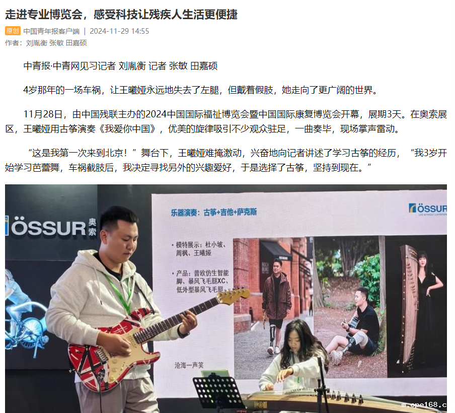 11月28日,由中国残联主办的2024米兰娱乐场网址大全开幕,展期3天。在奥索展区,王曦娅用古筝演奏《我爱你中国》,优美的旋律吸引不少观众驻足,一曲奏毕,现场掌声雷动。