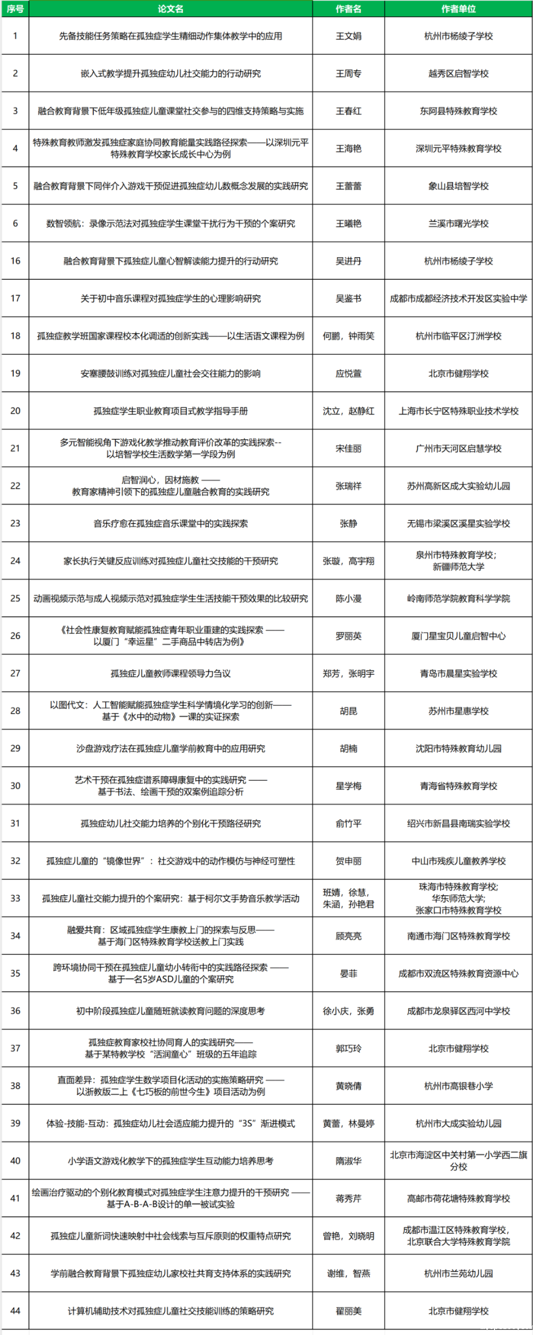 南京特殊教育师范学院特殊教育学院联合2025米兰娱乐场网址大全(CR EXPO)、中国教育学会特殊教育分会智障教育专委会、残疾人事业发展研究会融合教育专委会、江苏教育报刊总社现代特殊教育编辑部、北京教育科学研究院北京市特殊教育研究指导中心、北京市海淀区特殊教育研究与指导中心、杭州市上城区特殊教育指导中心等联合举办的“第二届孤独症教育教学论文征集”活动,征集到全国30个省市自治区738篇论文。经相关专家评审研究决定,共有22篇论文荣获优秀论文,44家篇论文荣获创新论文,68篇论文为鼓励论文。公布如下: