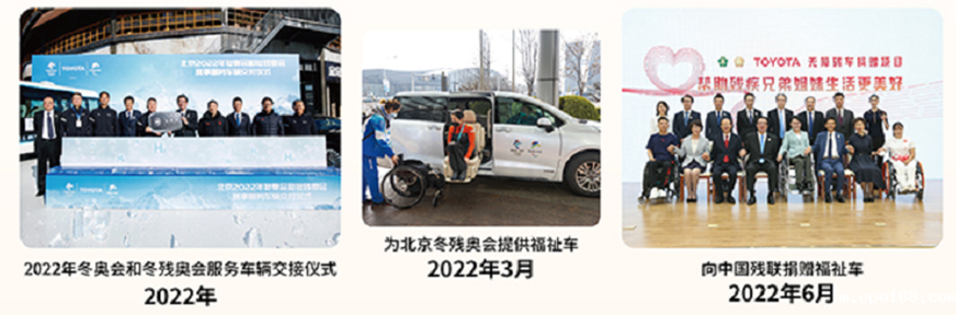 2022年6月,丰田将刚结束了北京冬残奥服务的238辆无障碍车(包括赛那、海艾士、柯斯达三种车型),全数捐赠给中国残疾人联合会,并通过中国残疾人福利基金会下发到全国215家残疾人机构,用于残疾人出行,并以此为契机,努力推进福祉事业在中国的发展。