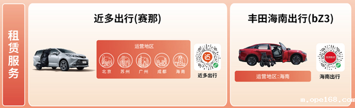 服务方面,为了能满足消费者的临时用车需求,自2024年5月开始,丰田中国联合丰田金融旗下近多出行,逐步在北京、广州、成都、苏州,海南,开展赛那/格瑞维亚的福祉车租赁服务。只需登录近多出行小程序或拨打客服热线即可体验。今年3月起,丰田海南出行也在海南推出了纯电动bZ3福祉车的租赁服务。