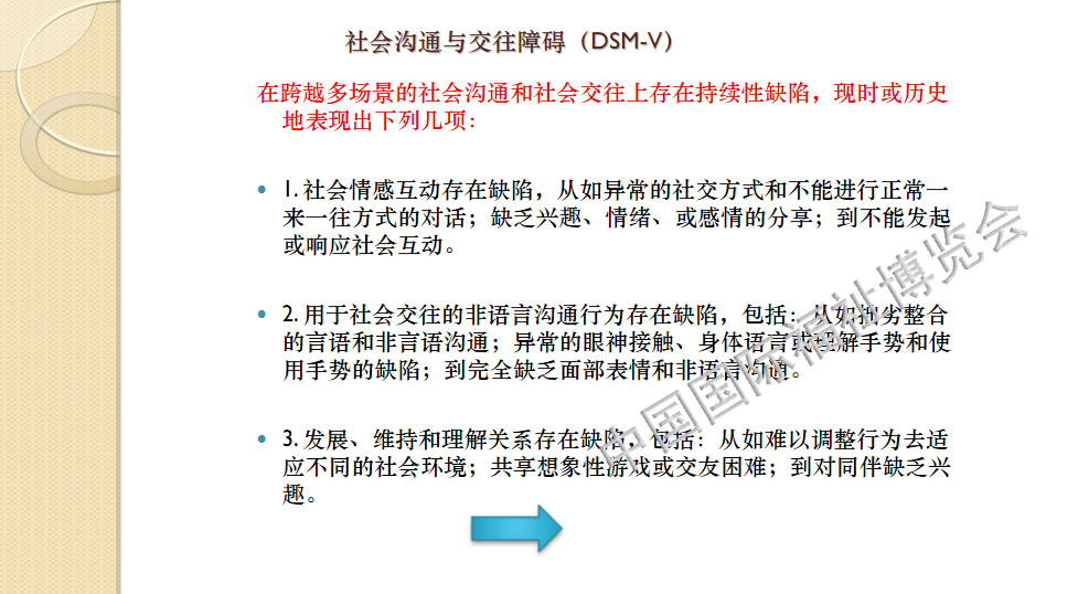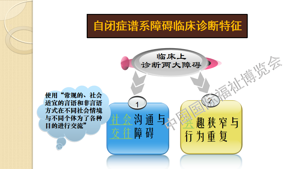 如上位分享嘉宾介绍,自闭症谱系障碍临床诊断特征包括两方面:社会沟通与交往障碍、兴趣狭窄与行为重复。这两方面具体特征表现的解读和分析,对于找到合适的教育和干预策略至关重要。