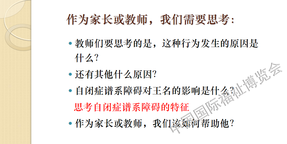 贺教授以”自闭症学生王名上课回答问题不举手“的案例为起点,告诉作为家长或教师,面对自闭症儿童这种行为表现,要从几个方面思考进而针对性采取有效的教育策略: