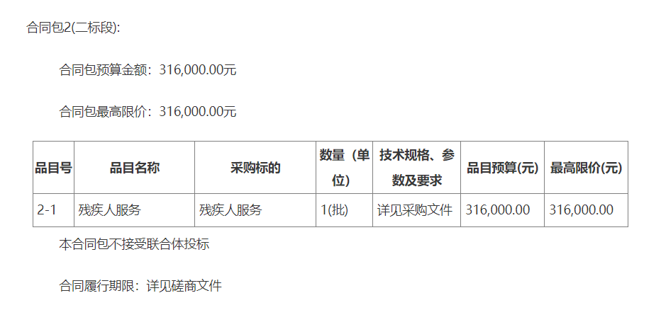 对处于就业年龄段的智力、精神残疾人及重度肢体残疾人进行托养服务,共计274人。对接受托养服务的残疾人提供以生活照料和护理、生活自理能力训练和社会适应能力训练为主,辅之以运动功能训练、职业康复与劳动技能训练等服务。本项目分三个标包(每个供应商可同时投多个标包,但最多只能中一个标包)。A包对处于就业年龄段的重度肢体残疾人进行托养服务,共134人,即20.1万元;B包对处于就业年龄段的精神残疾人进行托养服务,共120人,即18万元;C包对处于就业年龄段的精神残疾人进行托养服务,共20人,即3万元。