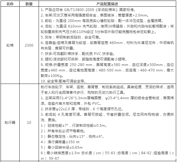 采购产品及数量:轮椅2300辆;助行器10个;电动助行器2个;多功能护理床1张。