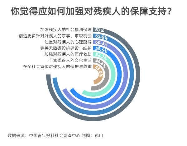 调查中,67.0%的受访者期待加强残疾人的社会福利保障,65.8%的受访者建议创造更多针对残疾人的求学、求职机会,60.3%的受访者希望注重对残疾人的心理疏导。受访者的建议还有:完善无障碍设施建设与维护(58.5%)、加强对残疾人的医疗救助(52.2%)、丰富残疾人的文化生活(46.6%)、在全社会宣传对残疾人的保护与尊重(43.8%)、完善并严格执行相关法律法规(29.8%)等。