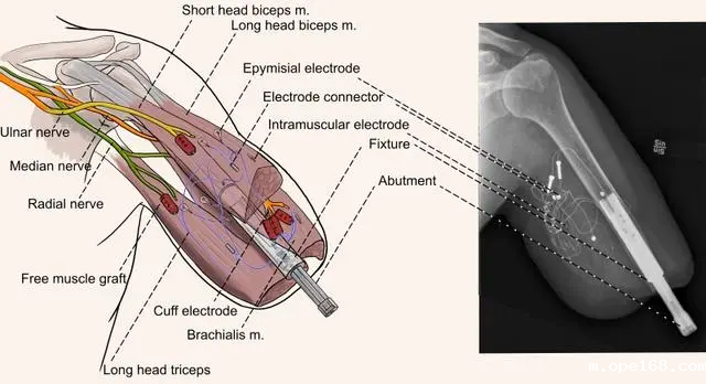 手术过程的示意图,创建用于控制假体的电神经肌肉结构。电极和骨整合接口分别提供与假体的电连接和机械连接。图片来源:《科学转化医学》