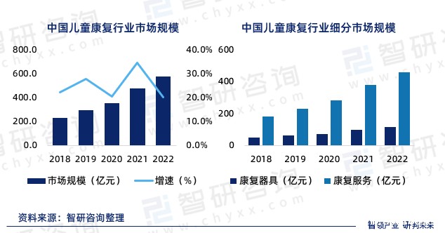 智研咨询《2023-2029年中国儿童康复行业市场深度监测及发展策略分析报告》显示,2022年我国儿童康复市场规模约为578.7亿元,2016-2022年CAGR为26.12%。