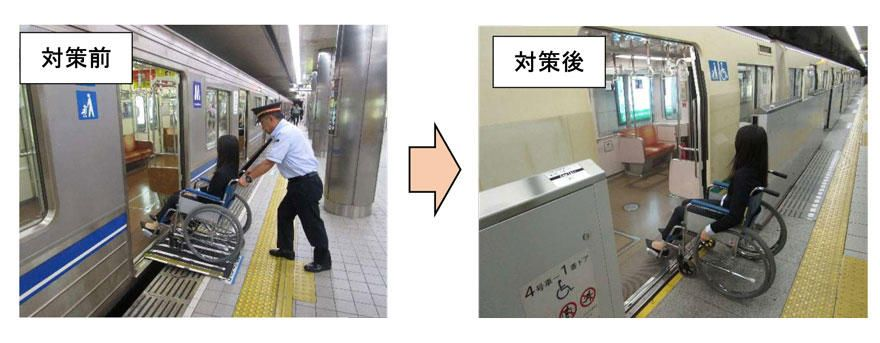 高度差的应对措施:将靠近电车一侧的站台地面垫高,形成面向电车逐渐升高的斜坡,减少电车与站台的高度差。