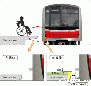 缝隙的应对措施:在站台前端设置梳状缝隙填充材料(橡胶制),以保证在电车与站台不接触的情况下将缝隙缩短至最小限度(20~30毫米)。