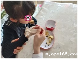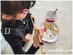 (2)进食:进食固体或半固体食物时,家长辅助下将食物盛入合适的碗里放在桌上,对于抓握较差的脑瘫儿童,可以用绷带固定手抓握勺子,家长一手辅助脑瘫儿童前臂旋前、旋后,一手环转腕关节将食物舀起送入口中(如图1-3、1-4),反复练习,提高其进食能力。对于能力稍好的脑瘫儿童,可以选取简单改装的筷子,如两根筷子顶部用橡皮筋各缠绕两圈固定的方式夹取食物进食(如图1-5、1-6)。