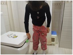 (5)穿裤子:儿童坐在凳子上,双手抓住一侧小腿使其交叉放在另一侧大腿上(或一侧下肢屈曲),把一侧裤腿穿到脚踝以上或者膝盖以上,交叉腿放下,另一侧同上。穿好后站起,如果独站不稳的儿童可单手扶物,用一只手将裤子拉起至腰部(如图2-11、2-12、2-13)。对不能独坐凳子的脑瘫儿童可以在床上进行。