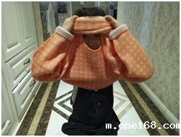 (3)穿套头衫:将套头衫的背面朝上,衣领朝下放在膝盖上,双手将衣服后背卷起直到露出袖口,一只手穿到相应的袖口,拉上衣袖直到露出前臂,另一侧同样的动作,然后将领子和衣服下缘拉在一起,将头套入领口,将衣襟拉下即可(如图2-6、2-7、2-8)。