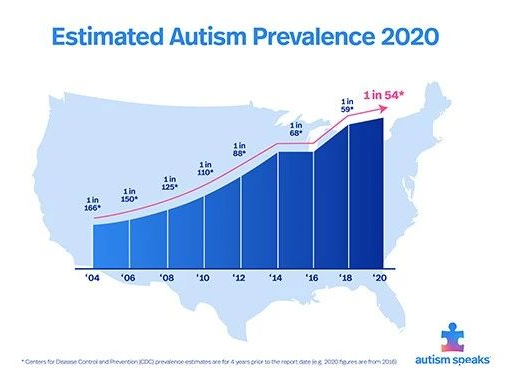 美国疾病预防控制中心(CDC)日前发布的数据显示:在美国,每54个儿童中就有1名患有自闭症(1:54),自闭症患病率比2016年提高了近10%。