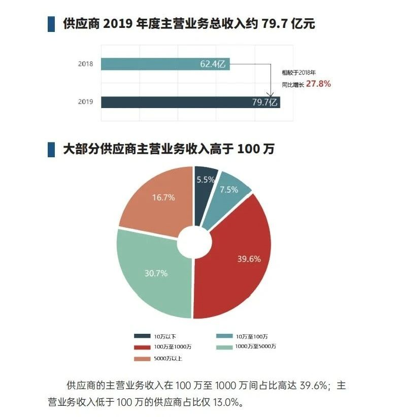 供应商2019年度主营业收入为79.7亿元,较2018年同比增长27.8%;总纳税额共计3.1亿元,较2018年同比增长24.2%。服务机构营业收入共计1.9亿元,较2018年同比增长23.0%;总纳税额共计0.12亿元,较2018年同比增长5.1%。